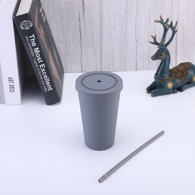 แก้วน้ำพลาสติก 2 ชั้น พร้อมหลอดสีเดียวกัน สีเทาแมทสวยน่ารัก ขนาด 700 มล.