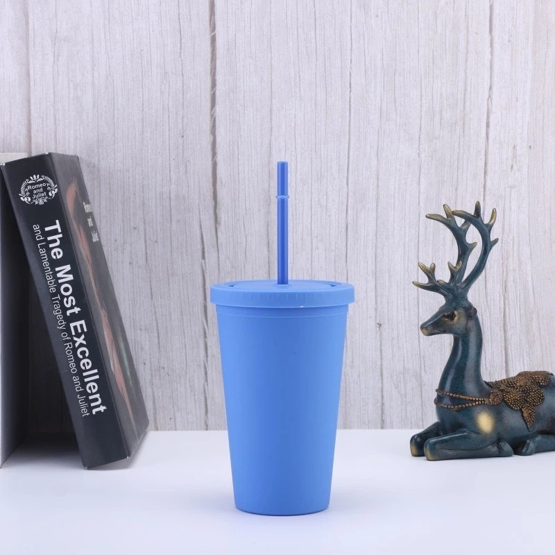 แก้วน้ำพลาสติก 2 ชั้น พร้อมหลอดสีเดียวกัน สีน้ำเงินแมทสวยน่ารัก ขนาด 700 มล.