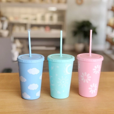 แก้วน้ำลายน่ารัก มีฝาปิดมีหลอด คละลาย 3 สี 3ิ ชิ้น